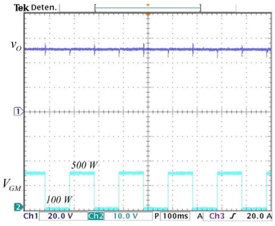 Closed-loop response to step changes in the load: (top) output voltage of converter (y-axis: 20 V/div), and (bottom) gate voltage of the MOSFET that changes the load from 100 W to 500 W (y-axis: 10 V/div) (x-axis: time 100 ms/div).