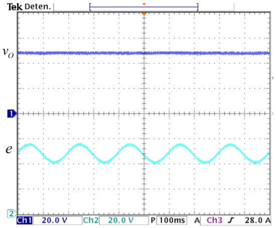 Output voltage response to input voltage variation: (top) output voltage (y-axis: 20 V/div), and (bottom) input voltage variation e (y-axis: 20 V/div), (x-axis: time 100 ms/div).