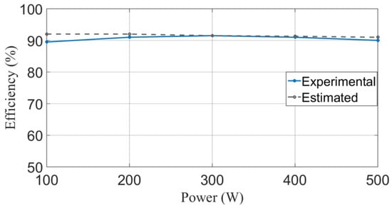 Finally, the estimated and experimental efficiencies for this converter were computed. The parasitic elements used to calculate efficiency are shown in the second column of Table 7. These values were obtained from the manufacturer’s datasheet of each component, whose serial number is shown in Table 4. Then, the individual losses are computed using the expressions obtained in Section 5. Finally, the results are shown in the third column of Table 6. Moreover, the power core losses are included (PLMC). According to the sum of the individual losses, the total power loss for the prototype is 49.57 W for a power output of 500 W. Evaluating the expression (23), the corresponding estimated efficiency is = 91%. Using a procedure similar to the one developed in Table 7, calculations were made to obtain the power losses and the estimated power efficiency from 100 W to 500 W; the results are shown in Table 8. Then, the experimental efficiency is obtained by measuring the input and the output power from the prototype at different loads, and it is compared with the estimated efficiency, as shown in Figure 20. It can be noticed that, in a full load (500 W), the experimental efficiency is 90.5%. Therefore, the estimated efficiency gives a good approximation of the experimental efficiency. Most of the power losses are in the active switches. Moreover, as can be seen, the efficiency remains almost the same for the suggested power range.
