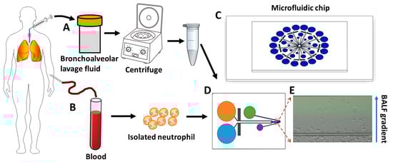 Illustration of the process of using a microfluidic device for testing neutrophil chemotaxis in the BALF gradient. (A) BALF collection and preparation. (B) Blood collection and neutrophil isolation. (C) The nine-unit radial microfluidic cell migration device. (D) The single detection unit of the nine-unit device. (E) A representative image of neutrophils in a COPD BALF gradient in the microfluidic channel at the end of the 30 min chemotaxis experiment. BALF: bronchoalveolar lavage fluid.