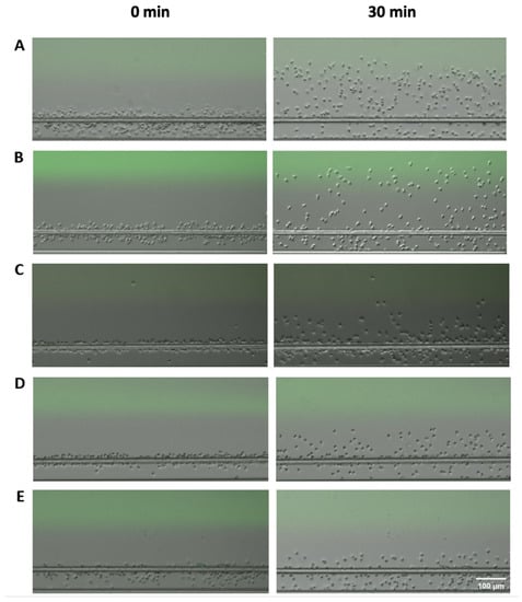 Microscopic images of neutrophil migration under different conditions at the beginning (left) and at the end of the experiment (right). (A) Neutrophil migration in the fMLP gradient; (B) neutrophil migration in the IL-8 gradient; (C) neutrophil migration in the LTB4 gradient; (D) neutrophil migration in the COPD BALF gradient; (E) neutrophil migration in the Control BALF gradient.