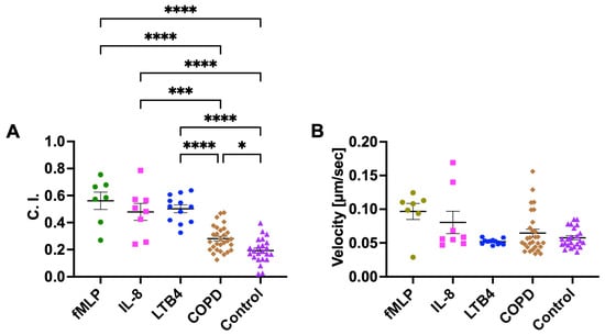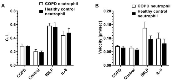 Next, we used neutrophils isolated from the blood of both COPD patients and healthy controls and compared their migratory dynamics in different BALF samples, fMLP, and IL-8 gradients. The results showed no significant difference in both C. I. and migration velocity between neutrophils from COPD patients and healthy controls for all conditions (Figure 4).