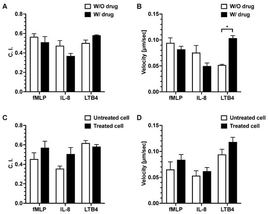 For the first set of experiments, where dexamethasone was diluted with the chemoattractant, the result showed that there was no significant difference in the neutrophil migration C. I. between the drug-added chemoattractant group and the chemoattractant alone group (without drug addition) (Figure 5A). There was a significantly higher neutrophil migration velocity in the LTB4 + drug group compared to the LTB4 alone group. No significant difference was observed in the neutrophil migration velocity between the drug-added chemoattractant group and the chemoattractant alone group for fMLP and IL-8 (Figure 5B).