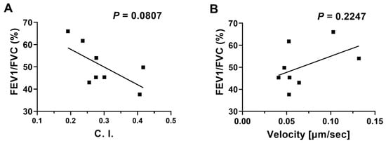 We compared the migratory dynamic data of neutrophil chemotaxis in COPD BALF with conventional COPD diagnosis parameters (i.e., the spirometry data). Although there was no significant relationship between the two sets of data, we noticed a trend of negative correlation between neutrophil migration C. I. in COPD BALF and FEV1/FVC (Figure 6A). Such a trend was not observed with neutrophil migration velocity (Figure 6B). We also compared the migratory dynamic data of neutrophil chemotaxis in COPD BALF with other clinical COPD diagnosis parameters (Supplementary Table S2). We found a negative correlation between neutrophil migration velocity and the COPD Assessment Test (CAT) score; however, such a relationship was not observed with neutrophil migration C. I. (Supplementary Table S2). Other than that, the migratory dynamic data of neutrophil chemotaxis in COPD BALF was not correlated with any clinical diagnosis parameters (Supplementary Table S2).
