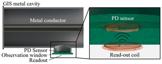 Installation of multi-resonant PD sensors and read-out coil on GIS. The passive wireless PD sensor is implanted inside the GIS to achieve highly accurate detection with high SNR. A readout circuit is utilized to wirelessly interrogate the PD sensor via the observation window.