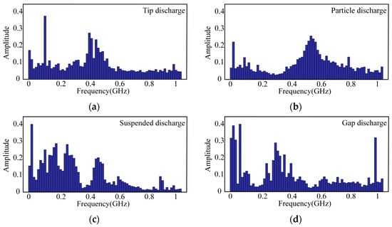 The frequency spectrum of four types of partial discharge. (a) Tip discharge. (b) Particle discharge. (c) Suspended discharge. (d) Gap discharge.