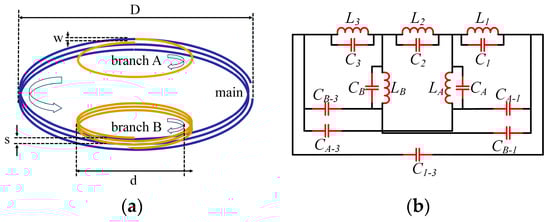The sensor configuration adopts a branch inductor structure, illustrated in Figure 3, wherein one end of the branch interfaces with the main inductor while the other remains suspended. This arrangement engenders a closed resonant circuit through capacitive coupling and inductive mutual inductance, with each branch assumed as a pivotal role in fostering multiple resonances. The unfolded architecture of the sensor, as depicted in Figure 3a, encompasses a principal branch and two ancillary branches labeled A and B. These components are intricately wound in opposite directions to configure spiral inductors. The primary inductor adopts a counterclockwise spiral orientation, while the two branch inductors exhibit a clockwise spiral direction. Adhering to this prescribed configuration, additional branches can be incorporated to augment the repertoire of resonant frequencies. This innovative design not only capitalizes on the inherent frequency characteristics of PD in GIS, but also facilitates the potential expansion of resonant frequencies through judicious structural modifications.