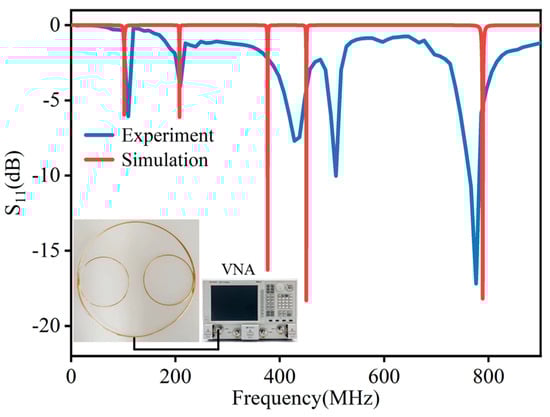 We constructed a simulation in ADS software 14.1 to investigate the spectrum performance of the sensor. The values of the parameters in the schematic setup are listed in Table 2. The corresponding parameters in simulations are decided by the theoretical calculation of the coils, such as the partial inductance and parasitic capacitance. The results of the S11 parameter in Figure 4 indicate five discernible resonance peaks within the 0–800 MHz range, precisely situated at 101.90 MHz, 207.60 MHz, 376.70 MHz, 450.80 MHz, and 788.90 MHz. We employed a vector network analyzer (VNA) to measure the resonant frequency as well. The testing result is illustrated in Figure 4. The measured S11 parameters also exhibit five resonant peaks in the 0–800 MHz spectrum, located at 109.5 MHz, 209 MHz, 427.9 MHz, 507.5 MHz, and 776.2 MHz, respectively, with the highest value recorded at −17.18 dB. The five resonant peaks displayed by the S11 parameter match the five main resonant circuits shown in the equivalent circuit diagram.