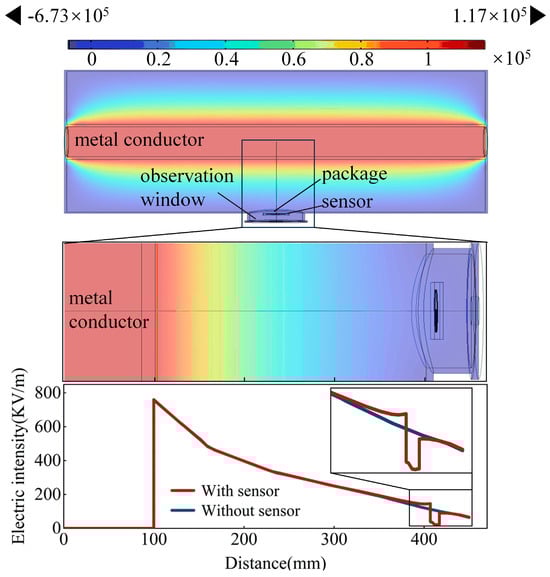 The sensor was strategically positioned at the observation window of the GIS and insulated with epoxy resin. The package thickness was 5 mm. The results in Figure 5 illustrate the distribution of electric potential and field strength.