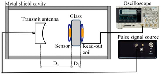 We employed a metal tank with an outer wall diameter of 360 mm, a wall thickness of 30 mm, and a height of 500 mm as the electromagnetic shielding cavity. Inside the shield cavity, the transmitting antenna, multi-resonant PD sensor, and readout coil are coaxially aligned. The RF coaxial line transfers the collected signal to the oscilloscope. Simultaneously, a 10 cm × 10 cm × 3 cm glass is employed to mimic a GIS observation window inserted between the wireless PD sensor and readout coil, as shown in Figure 6.