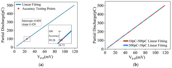 Fitting function between peak-to-peak value of multi-resonant PD sensor signal and discharge amount: (a) accuracy at discharge amount of 100 pC; (b) the linear fitting of the increase and decrease in the amount of discharge.