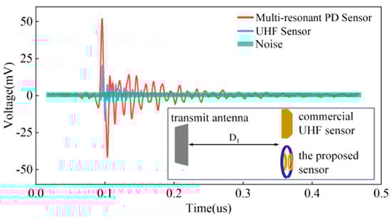 Figure 8 presents received signal strength comparisons between our PD sensor and the commercial UHF sensor. The experimental findings reveal that, under identical distances and discharge power settings, the signal received by the proposed sensor (VPP = 93.67 mV) is almost 2.5 times of the voltage received by the commercial UHF sensor (VPP = 37.33 mV). The signal-to-noise ratio SNR of the signal received by the proposed sensor is 68.82 dB, while SNR of the commercial UHF sensor is 50.42 dB. This observation indicates that the detection capability of the multi-resonance PD sensor is more potent compared to that of the commercial UHF sensor.