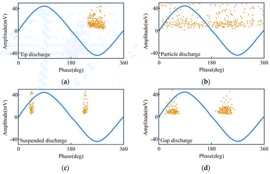 Figure 9a illustrates that tip discharge pulses predominantly occur in the 225°–315° phase range. Conversely, as Figure 9b demonstrates, particle discharge pulses lack a discernible pattern, appearing randomly throughout the power frequency cycle. Figure 9c indicates that suspension discharge pulses are limited to the 45° and 315° phases. Finally, Figure 9d shows that gap discharge pulses are primarily concentrated in the 30°–60° and 210°–240° phase intervals.