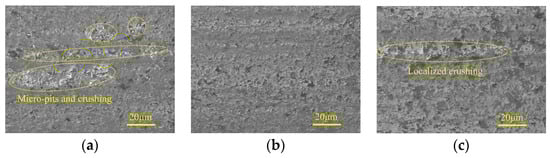 Figure 4 shows the micro-morphologies of ground surfaces in three machining stages under different spindle speeds. Figure 4a,d indicate that in the rough grinding step, SiC is mainly removed by brittle fracture with obvious traces. When the spindle speed is 2000 r/min, material crushing with considerable area occurs due to the large, undeformed chip thickness of the individual active abrasive grain. With the increase of spindle speed, the material crushing phenomenon is effectively inhibited, and the machined surface is occupied by numerous irregular micro-pits, leading to an improved surface quality. In the semi-finishing machining stage, attributed to the increased particle size of the grinding wheel and reduced grinding depth of the cut and feed rate, the material ductile remove ratio is considerably increased, which is conducive to suppressing surface defects. When low spindle speed is adopted, grinding grooves with brittle fracture traces along the feed direction can be observed on the machined surface, forming damage regions with a strip distribution. An increase in spindle speed leads to a decrease of the above surface defects, resulting in a smooth and flat machined surface. In the finishing machining step, the influences of spindle speed on ground surface quality are similar to those in the semi-finishing step.