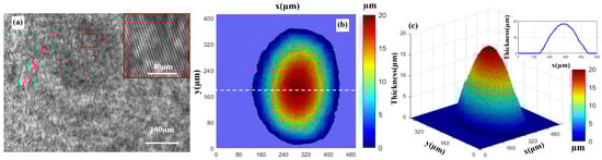 The captured background image and the enlarged image of the stripes are shown in Figure 2a. Figure 2b records the thickness distribution of a liquid droplet under the camera’s field of view, Figure 2c is a 3D display of Figure 2b, and the insert map shows the cross-sectional thickness distribution of the liquid droplet along the line in Figure 2b.