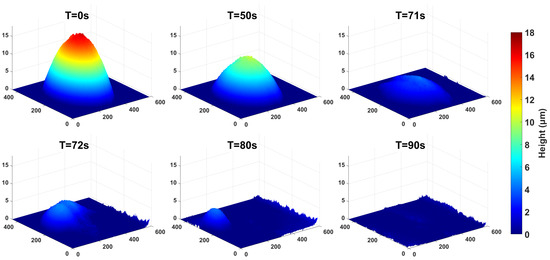 Additionally, this phenomenon changes and disappears rapidly after 71 s of droplet evaporation. As shown in Figure 3, the sudden change in contact angles at and dissipates after 71 s, and the contact angle values of the water droplets at the same time are in a state of concentrated distribution. The reason is that after 71 s, the water droplet is in the SJ mode, where the surface tension of the water droplet can no longer maintain its original shape and thus collapses rapidly. That is, the contact area of the water droplet shrinks or even shifts as a whole, as shown in the subplots of T = 71 s and T = 72 s in Figure 3. This process occurs quickly, which is reflected in Figure 6 as an obvious discontinuity in the change of the water droplet contact angle at 71 s.