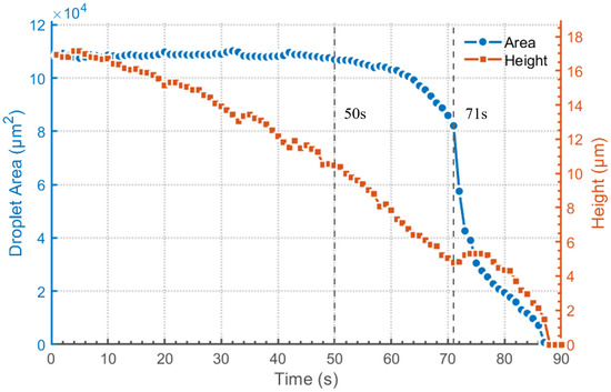 An analysis is conducted on the changes in the contact area and height of the droplet over the 90 s period. The results are shown in Figure 4. The blue line represents the contact area of the droplet, while the orange line represents the droplet height. From the experimental results, it is evident that the evaporation process of the droplet can be divided into three stages. In the first stage, from 0 to 50 s, the water droplet evaporate in the constant contact radius (CCR) mode, with the height and contact angle decreasing continuously. In the second stage, from 50 to 71 s, both the contact angle and contact radius of the water droplet decrease simultaneously, which is referred to as the stick-slip (SS) mode. In the third stage, the water droplet enter the stick-jump (SJ) mode. In this mode, the retraction speed of the contact line is faster than the decrease rate of the droplet height. This results in a sudden change in the droplet shape after the contact line jumps, leading to a phenomenon where the droplet height increases instead of decreasing and the droplet area shrinks sharply. This is consistent with the droplet changes shown in Figure 3, which occurred around 71 s. We have carried out a series of experiments. The droplet goes through three similar stages, which are CCR, SS, and SJ. Moreover, the time points for switching between different stages are also very close.