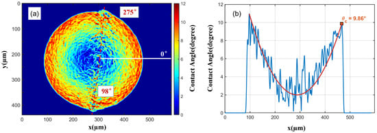 Subsequently, the analysis and test of the water droplet contact angle are shown in Figure 5. The contact angle can be obtained by calculating the gradient of the water droplet height function , as described in . This gradient represents the slope variation of the water droplet surface. This is reflected in Figure 5a as high gradient values at the edge of the water droplet, which is due to the abrupt change in slope from the cover glass to the water droplet; meanwhile, the gradient gradually decreases toward the interior of the water droplet. Figure 5b shows a cross-sectional view of Figure 5a along the 0-degree direction. The maximum gradient value appearing at the water droplet edge indicates the gradient value at the contact radius of the droplet. Thus, it is recorded and converted into the actual angle through to intuitively display the magnitude of the contact angle, while the red line represents a fitted curve to illustrate the gradient variation inside the water droplet.