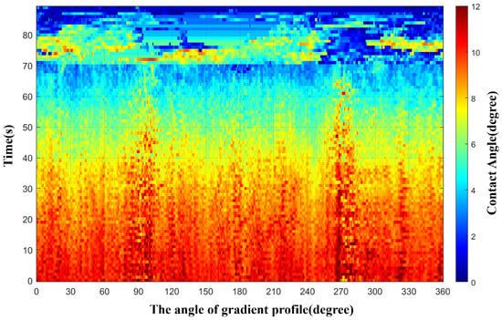 In order to further analyze the abrupt change in the size of the contact angle and the variation of this abrupt phenomenon in the time domain, we performed 360-degree gradient sectioning on a single water droplet image and searched for the maximum gradient at the droplet edge to obtain the contact angles in all directions around the droplet perimeter. The results are shown in Figure 6, where all data recorded within 90 s were processed for contact angle analysis. The abscissa represents the variation of contact angles along the 360-degree range of a single image, and the ordinate represents the variation of contact angles at a certain section angle across different time. Two key phenomena are evident from the figure. First, before 71 s, there is an obvious climb in the size of the contact angle at and . Second, within the first 71 s, the contact angle showed a uniform and gradual decrease overall. After 71 s, due to the morphological abrupt change and displacement of the water droplet, the contact angle exhibited obvious discontinuities, the values increased instead, and the abrupt change in the contact angle has disappeared, which is consistent with the intuitive observation of the dynamic evaporation process in Figure 3.
