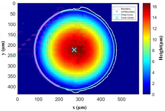 We also researched and analyzed the edge morphology of the water droplet. As shown in Figure 7, which displays the top view of the water droplet height at T = 0 s, we selected the boundary data (purple) of the droplet to the left of m to complete circular fitting (blue), with the cross in the middle denoting the center of the fitted circle. The plotting results show that the water droplet was not a regular circle. On the right side of the droplet, the contact area exceeded the range of the fitted circle, and the starting boundary of the excess part was precisely near and , as mentioned in the above phenomenon. The reasonable explanations for this phenomenon are as follows.
