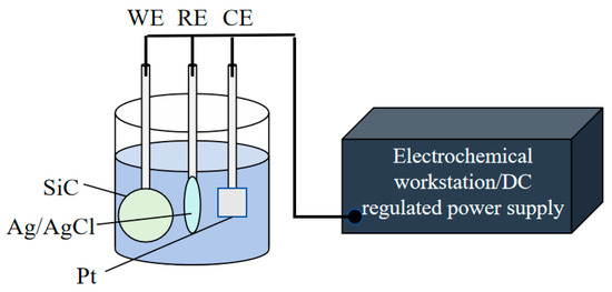 The experimental setup of the electrochemical workstation is shown in Figure 1. The electrochemical measurements were performed using a Wuhan Corrtest CS310M workstation with a potential control range of ±10 V and a current control range of ±2 A. The potentiodynamic polarization measurements were conducted at a scan rate of 10 mV/s. For static corrosion tests requiring higher potentials, a DC regulated power supply with a potential range of 0–60 V and a current range of 0–5 A was employed. A standard three-electrode configuration was adopted: (1) A SiC sample secured by a platinum sheet electrode clip served as the working electrode, (2) a 10 × 10 × 0.2 mm platinum sheet as the counter electrode, and (3) a silver/silver chloride (Ag/AgCl) electrode as the reference electrode. The SiC samples with a diameter of 50.8 mm were supplied by TankeBlue Co., Ltd., including 4H-0°, 4H-4°, 6H-0°, and 6H-4° types. Experiments were conducted on the Si-face (0001) of SiC samples, with an initial surface roughness of approximately 1.5 nm (Ra) and no obvious oxidation on the surface. All experiments employed NaCl solution as the electrolyte.