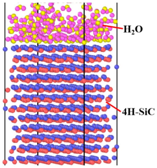 To deeply explore the nanoscale electrochemical interaction mechanism at the SiC interface, a reactive molecular dynamics simulation was employed to resolve atomic-level reaction details and interfacial evolution. In this study, the Lammps software (Version number: lammps-64bit-11Aug2017-MPI) was used to construct a SiC crystal structure model. According to the lattice parameters of the 4H-SiC unit cell (a = 3.076 Å, c = 10.053 Å), a 4H-SiC unit cell structure with an inclination angle of 0° and a Si face on the upper surface was precisely constructed, and a SiC model was formed through periodic expansion. Water molecules were added to the upper surface of the SiC model to simulate the interfacial electrochemical reaction environment, and a fixed layer and a constant temperature layer were set on the lower surface of the model. The simulation model is shown in Figure 2.