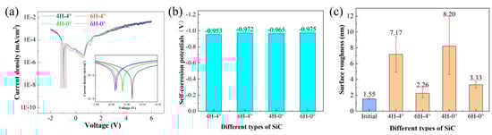 Potentiodynamic polarization tests were conducted on four different types of SiC, and the polarization curves are shown in Figure 3a. It could be seen that there were obvious passivation regions in the electrochemical corrosion of all four types of SiC. The self-corrosion potentials obtained from the polarization curves are shown in Figure 3b. The self-corrosion potential of the 4H-4° sample was −0.953 V, while that of the 6H-4° sample was −0.972 V. The 4H-0° sample had a self-corrosion potential of −0.965 V, and the 6H-0° sample’s self-corrosion potential was −0.975 V. Evidently, the self-corrosion potentials of all samples showed minimal variation, indicating comparable corrosion characteristics among the four SiC types.