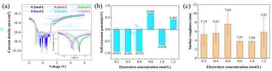 Potentiodynamic polarization test results of SiC with different electrolyte concentrations: (a) potentiodynamic polarization curves; (b) self-corrosion potential; (c) surface roughness of SiC.