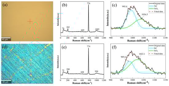 Raman spectral detection results on SiC surface: (a–c) before corrosion; (d–f) after corrosion in 0.6 mol/L electrolyte.