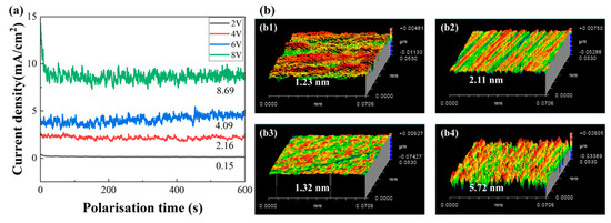 Following the electrolyte selection, the optimal anodic polarization potential was investigated by applying potentiostatic polarization at voltages ranging from 2 V to 8 V. The resulting current density curves (Figure 6a) revealed a voltage-dependent increase in corrosion activity. The measured current densities were 0.15, 2.16, 4.09, and 8.69 mA/cm2 at applied voltages of 2, 4, 6, and 8 V, respectively. It could be found that the current density exhibited a stable and consistent upward trend with increasing voltage throughout the polarization period, indicating active dissolution behavior without passivation within the 2–8 V range.