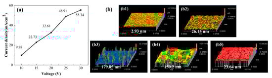 The corrosion behavior of SiC substrates at elevated voltages (>10 V) was characterized using a DC power supply, with the voltage-dependent current density profiles presented in Figure 7a. The data revealed a monotonic increase in current density with applied voltage up to 25 V, followed by a marked reduction in growth rate within the 25–30 V range. This transition suggested the onset of passivation layer formation, which likely inhibited the electrochemical corrosion process at higher potentials.