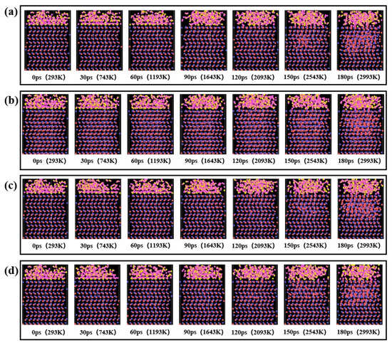 Reactive molecular dynamics simulations were performed to investigate the interfacial chemical reactions between 4H-SiC and H2O molecules under combined thermal (293–3293 K) and electric field (0–0.05 V/Å) conditions, with periodic boundary conditions applied in all directions. The electric field was applied along the z direction from bottom to top, establishing the SiC as the anode. The system temperature was linearly increased from 293 K to 3293 K within 200 ps. The simulation processes under different electric field intensities are shown in Figure 8. The heating process revealed distinct temperature-dependent evolution in both the atomic structure of SiC and its interfacial reactions with water molecules. When the temperature rose to 1643 K, localized deformation initiated in the surface atomic structure, accompanied by partial transformation of SiC into an amorphous phase. Further heating to 2543 K triggered the penetration of oxygen and hydrogen species into the SiC lattice. Upon reaching 2993 K, the SiC lattice was basically amorphized except for the fixed layer and the constant-temperature layer, and a large number of oxygen and hydrogen atoms penetrated into the SiC lattice. These structural transformations demonstrated progressively intensified interfacial reactions between SiC and water molecules with increasing temperature and simulation duration.