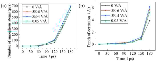 Number of atoms in amorphous state (a) and depth of corrosion (b) versus time at different electric field strengths.