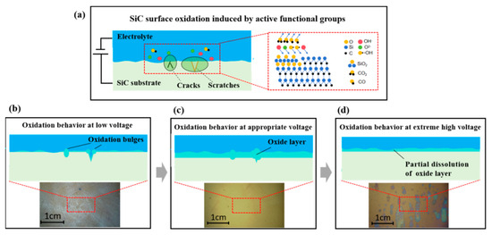 Electrochemical corrosion mechanism (a) and reaction processes (b–d) of SiC substrates at different voltages.