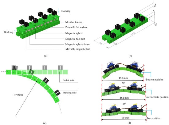 Deformation-controllable magneto-elastica-reinforced composite elastomer. (a) Structural assembly of a magneto-elastic soft robot cell; (b) the main structural dimensions of the magneto-elastic soft robot cell; (c) comparison of the bending state of the magnetic ball before and after assembly; (d) the axial elongation of a movable ball and a soft robot.