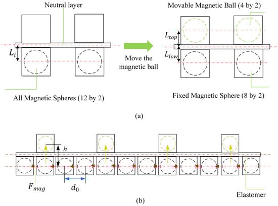 Shape morphing mechanism of MERE actuator. (a) Approximate cross-section of an elastomer; (b) magnetic elastomer and magnetic sphere movement distribution structures.
