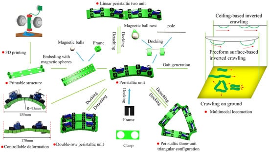 Based on an on-demand docking modular design method, multiple soft units can be flexibly assembled into morphological patterns of different dimensions. An exploratory framework is proposed, as shown in Figure 3.