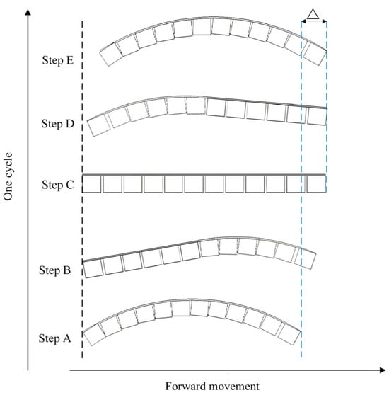 Crawling animals, being mostly made of compliant tissues, are perfect models for mobile soft robots. Crawling occurs when the agent overcomes friction through longitudinal vibration or movement. Crawling locomotion includes several different gaits, such as two-anchor (inchworm-like) crawling [,], peristaltic (earthworm-like) crawling [], and serpentine crawling [,]. Existing studies have shown that soft body crawling robots generally adopt a multi-segment soft structure design [], and that the contraction–diastolic motion is achieved through the quasi-static deformation of pneumatic/dielectric elastomer actuators [,]. For example, a modular soft robot was proposed by Hongjun et al. []. The principle of two-anchor crawling has been extensively studied in caterpillars, where the animal moves forward by lengthening and shortening its body. The out-of-plane bending-based inching locomotion is usually achieved by rising and sprawling the central parts of a body that looks like an “”, and the distal parts provide the anisotropic friction. The soft mobile unit proposed in this paper also adopts the motion strategy of periodic deformation, and its specific forward gait can be explained by Figure 4.