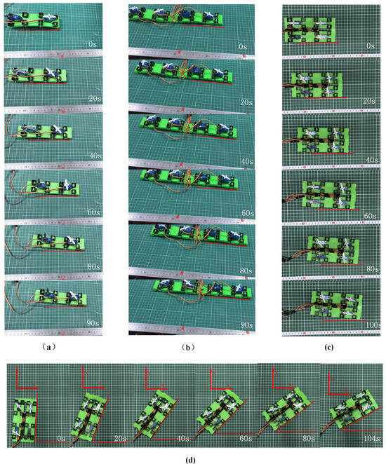 Crawling experiments of soft crawlers. (a) Single-unit structure crawling gait; (b) linear dual-unit structure; (c) straight-line motion; (d) turning motion.