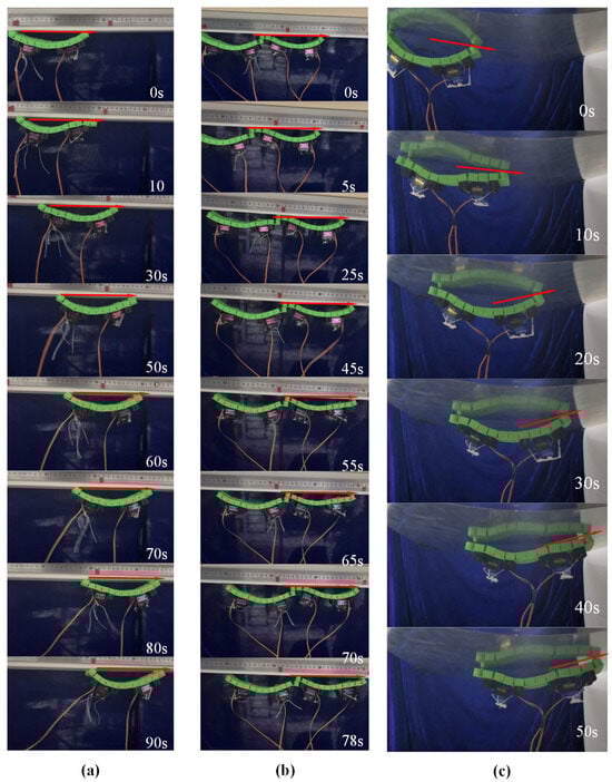 According to our proposed model’s actual actuation and deformation, the waveform parameters for the crawling gait of a single unit are . Therefore, the theoretical crawling speed for a single unit is approximately 2.42 . For comparison, the experimentally measured crawling speed (see Figure 5) is 1.11 mm/s. For a linear dual-unit configuration, the theoretical model parameters are , yielding the same theoretical crawling speed of 2.14 , while the actual crawling speed is 1.05 .