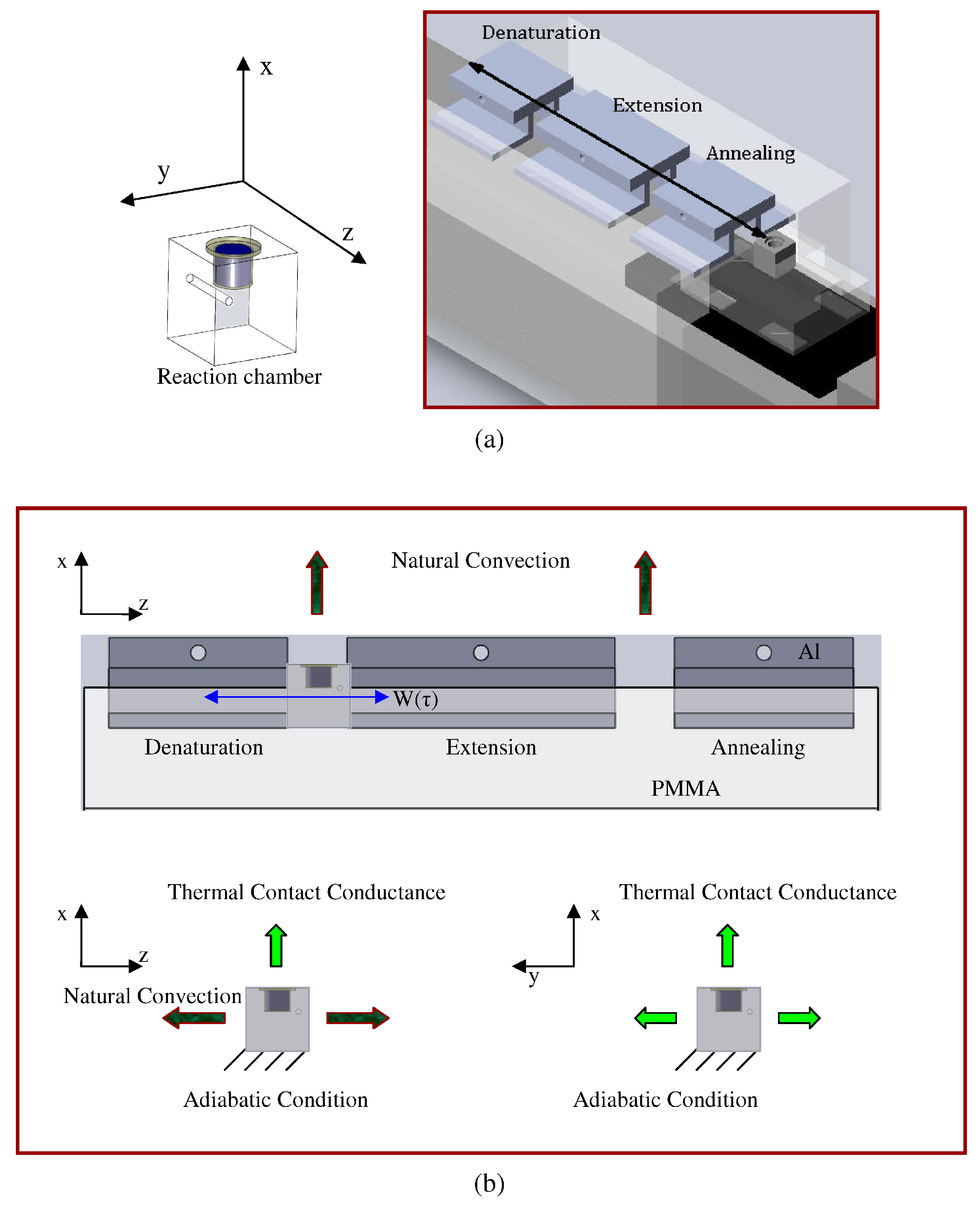 While a number of publications on PCR have dealt with the amplification performance of the CFPCR devices, there were few attempts to systematically analyze the thermal characteristics among these devices. Numerical studies of the heat transfer in CFPCR devices have been conducted. Some have dealt with the thermal characteristics of the system as the amount of the PCR mixture is small and the influence of the PCR mixture on the temperature pattern of the device is negligible. Zhang et al. [11] studied the temperature patterns of two kinds of CFPCR systems by using finite element analysis (FEA). Bu et al. [12] proposed a microfluidic chip for DNA amplification. A two-dimensional thermal model was used for the optimization of the location of the heater. Li et al. [13] presented a CFPCR microchip with a serpentine channel of varying width. The optimized spacings between the heaters were determined by utilizing FEA and a semi-analytical heat transfer model. Zhang and Xing [14] developed a thermal gradient PCR. A fin design was utilized to create a desired temperature gradient for their device. Allen et al. [15] investigated the coupling between the reaction and flow during PCR in a Rayleigh-Bénard (RB) convection cell. They numerically solved the combined momentum and heat transfer equations for a two-dimensional RB cell. Chen et al. [16] fabricated a fully integrated microsystem for CFPCR. The commercial software is utilized to determine the geometric characteristics between the heating assemblies that are responsible for creating the three specific temperature regions within the chip.
