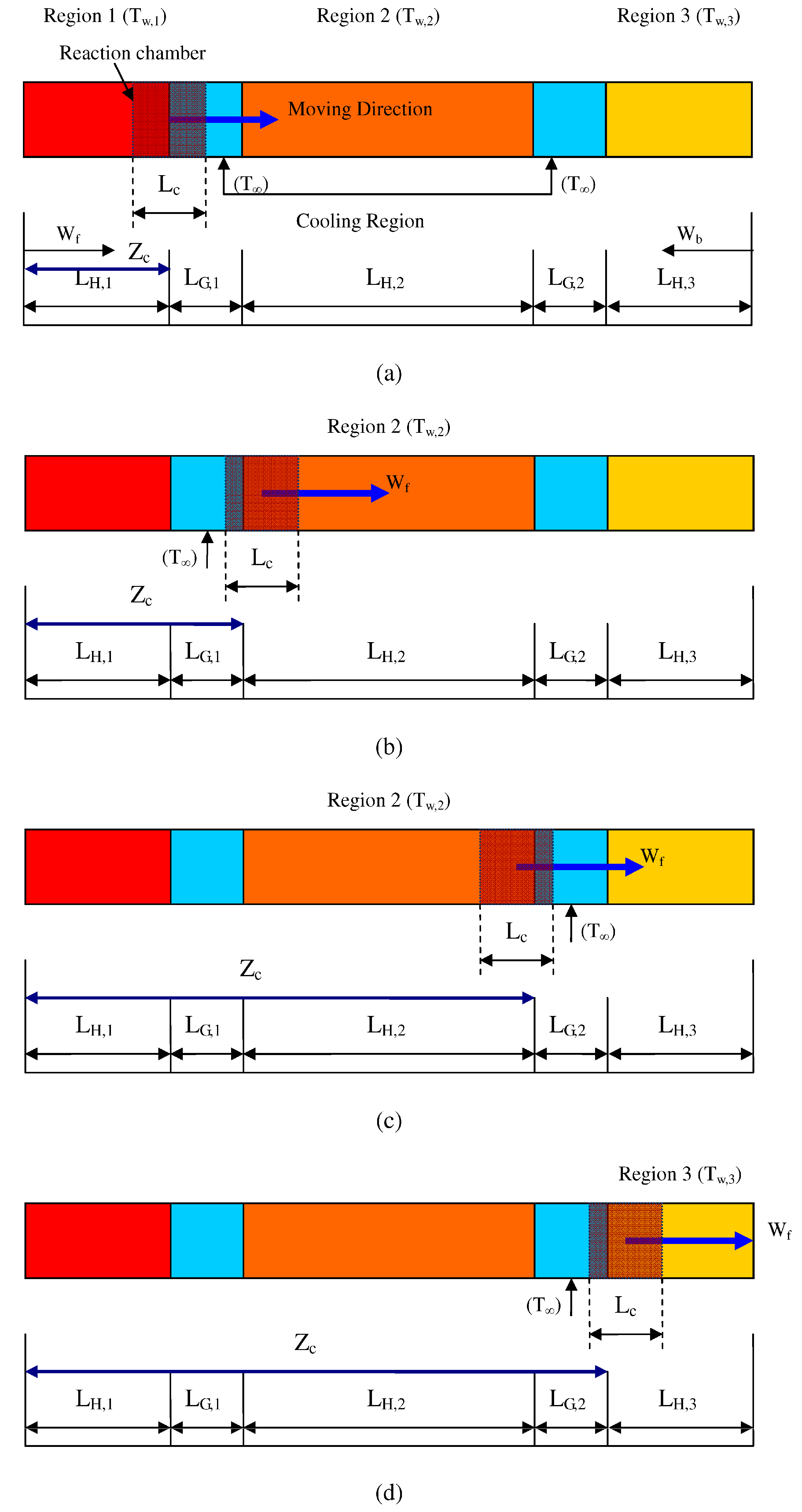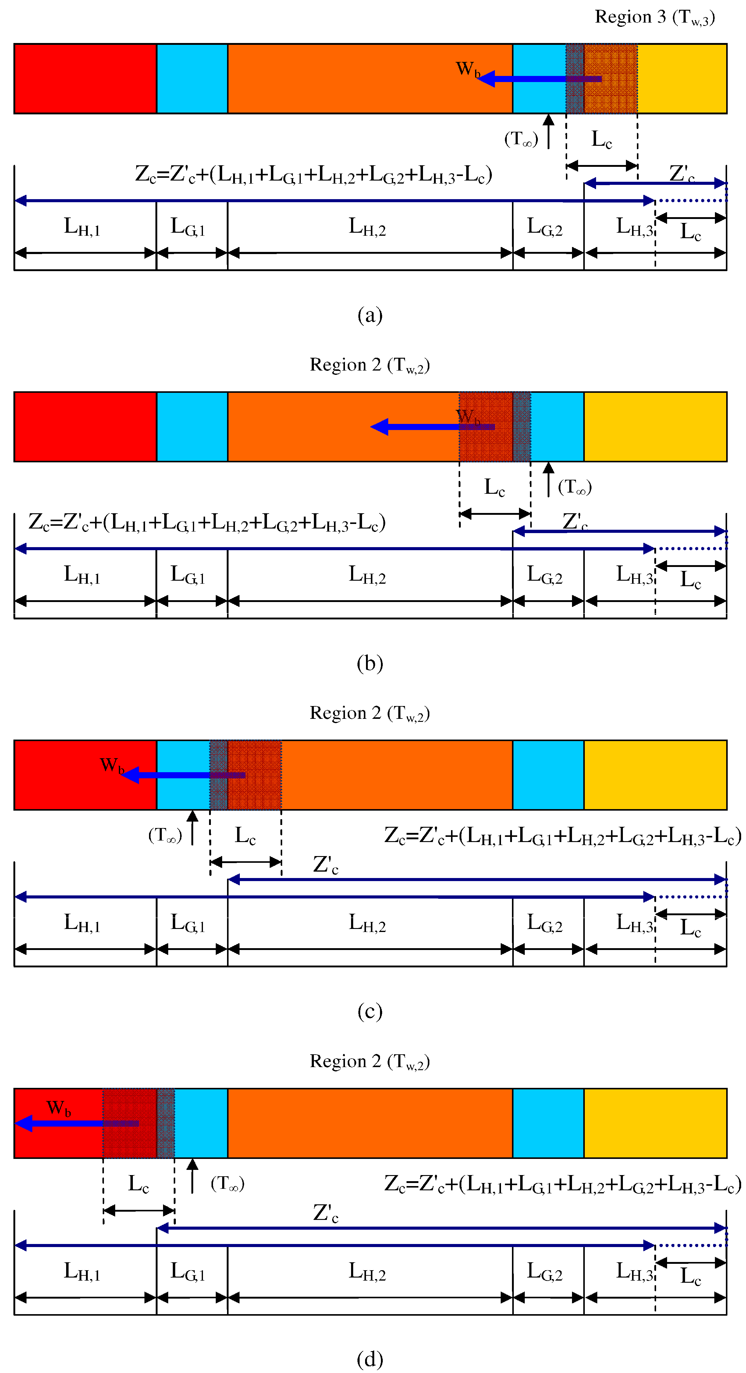 when the chamber is moving into the second heating region (Figure 2b), Zc is LH,1 + LG,1. When the chamber is moving into the third heating region (Figure 2d), Zc is LH,1 + LG,1 + LH,2 + LG,2.