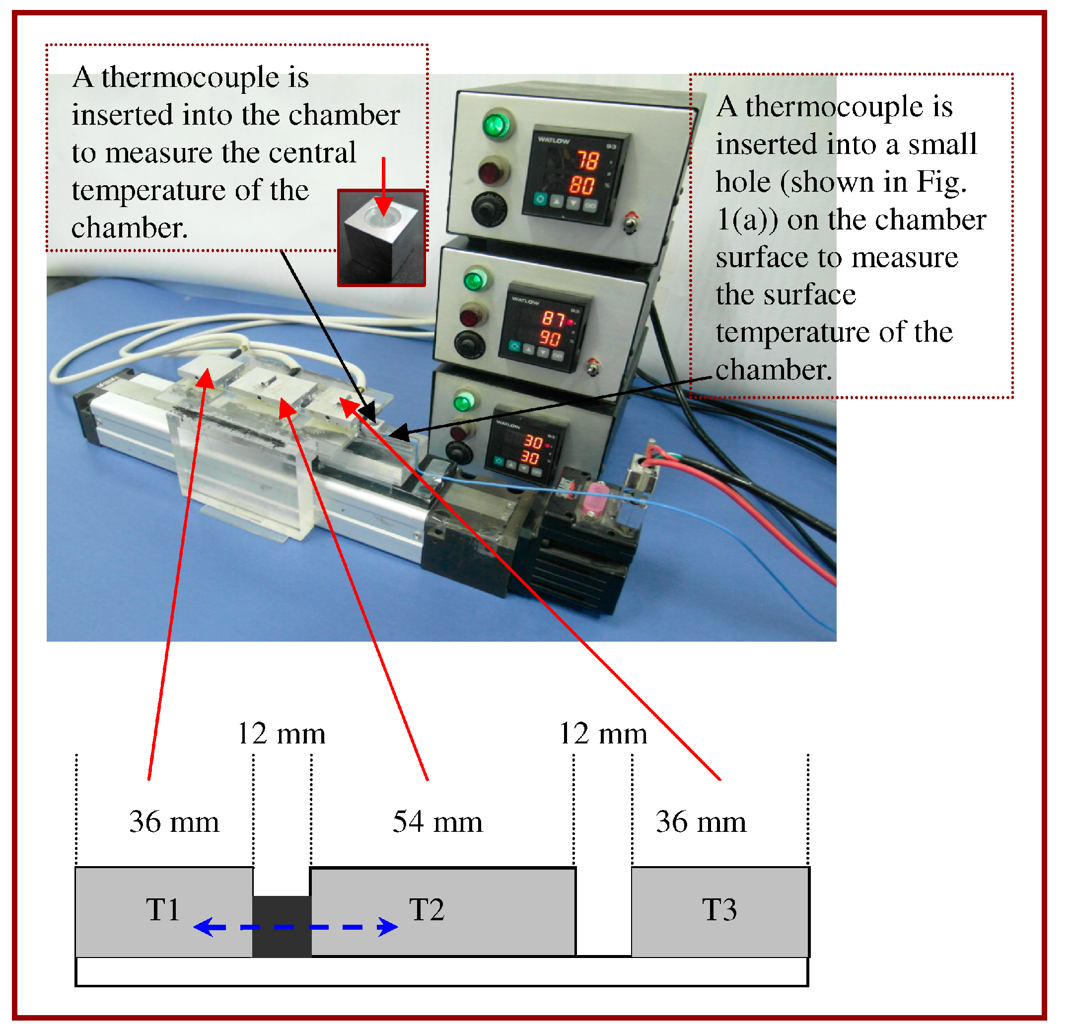 The size of the thermostatic block is different and chosen for matching the demands of the temperature program in the PCR process. A slot at the central part of the block along the z-direction is made by the micromilling machine, and the chamber block can pass through it without contacting. The three aluminum segments are equipped with three cartridge heaters and three thermocouples for controlling the temperature precisely. The three parts are mounted together linearly on a PMMA frame with air gaps of 12 mm between them in order to avoid a thermal interference among the three isothermal blocks. These gaps are the cooling regions with natural convection.