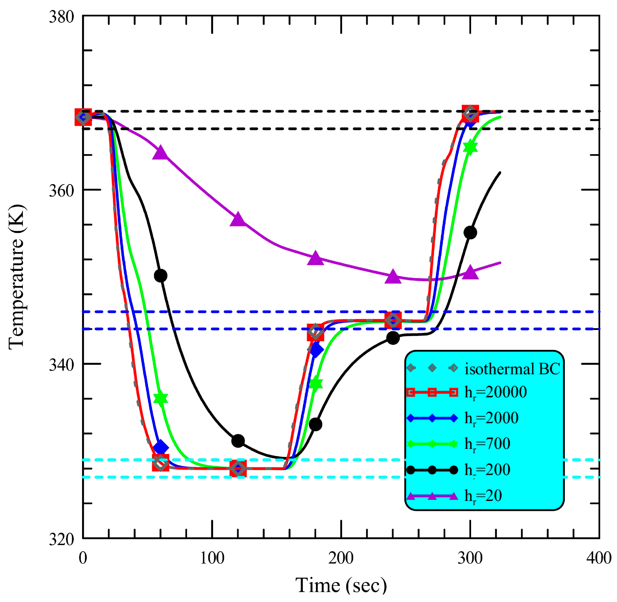In this work, the chamber moves through different heating and cooling regions. On the other outer surfaces of the chamber mass when the chamber is moving inside the cooling regions, i.e., between two heating regions, the convective boundary condition is used as: