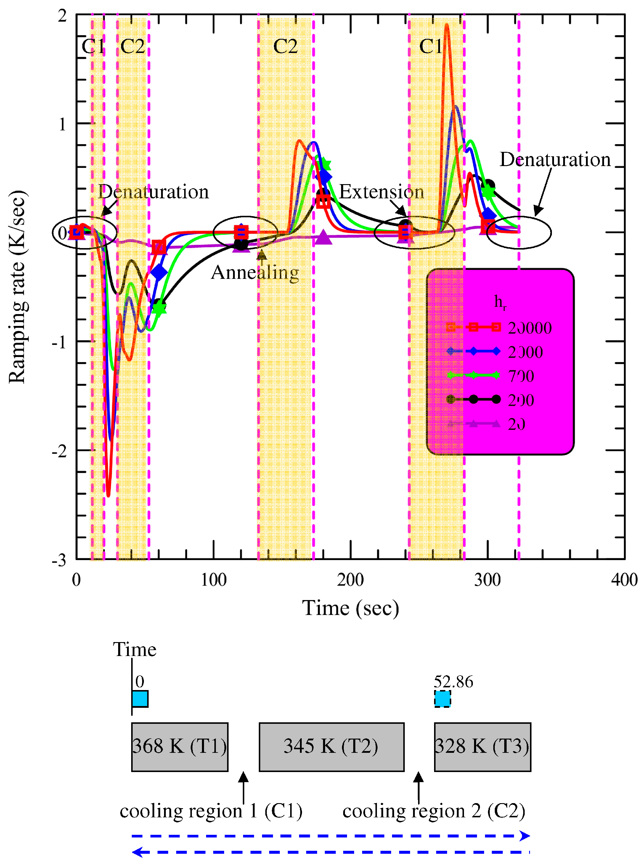 For efficient DNA amplification, the temperature change of the sample is one of the main concerns during the PCR process. Ramping rate is defined as the rate of change in temperature over time, as it determines how fast the PCR device can change temperatures, and therefore how rapidly it can achieve a given number of thermal cycles. From the previous results in Figure 5, it shows that the effects of various thermal contact conductance coefficients have a significant impact on the thermal field of the reaction chamber. To further realize the influence of various hr on the temperature change of the chamber, the profiles of the ramping rates of the sample are depicted in Figure 6. The positive value of the ramping rate is taken as the heating rate, and the negative one is the cooling rate. The chamber starts from region T1 (368 K), then passes region T2 (345 K) and approaches region T3 (328 K). During the time period from 0 to 52.86 s, the chamber temperature is decreased from 368 to 328 K and the DNA sample is moving from the denaturation step to the annealing step. Results show a negative ramping rate of the chamber and the maximum cooling rate rises with the increasing of hr. With the higher hr the chamber temperature can reach the reaction temperature more rapidly and drop faster. When the chamber goes through region T2, we can find that the cooling rate starts to decrease. And then the chamber passes the second cooling region and the cooling rate increases again. After entering region T3, the cooling rate decreases for a second time and the zero value of the ramping rate is shown. It means that the annealing step is proceeding. When the chamber arrives at the end of region T3, the linear motor is reversed. When the chamber comes into region T2 from region T3, the positive ramping rate of the chamber is shown. The zero value of the ramping rate is observed again, and the sample in the chamber is moving on to the extension step. The chamber keeps moving to region T2 and one thermal cycle is finished when the chamber re-enters region T1. The chamber continues from region T2 to region T1. It shows that the heating rate increases rapidly and the denaturation step is coming. And then the maximum heating rate can be enhanced with the increasing of hr. Thus the ability to conduct heat between the heater and the chamber surface is dominated by the thermal contact conductance coefficient. The ramping rate of the chamber during PCR can be improved by reducing the thermal contact resistance.