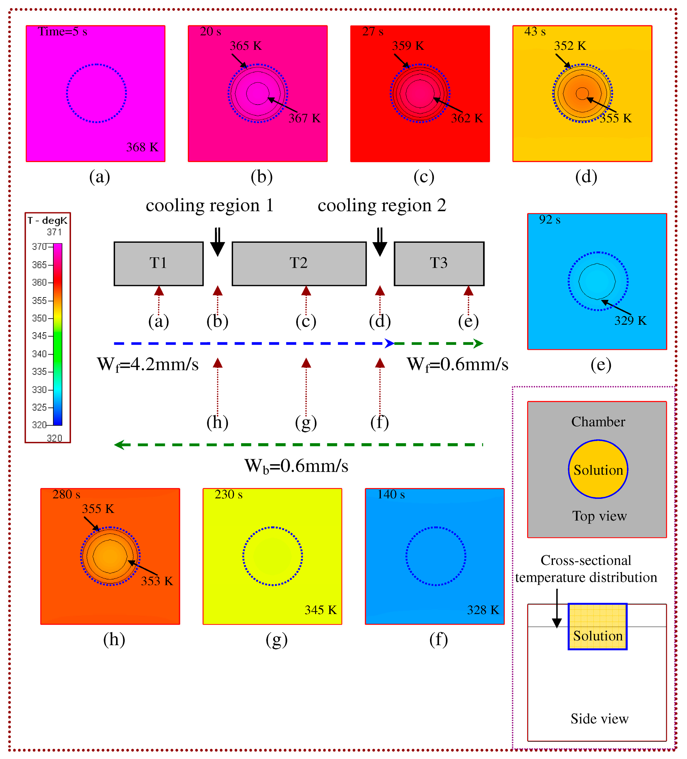 After the chamber reaches the end of the third heating region, it moves back with the speed Wb. As the chamber moves backward from the heating region into the cooling region, the boundary condition is similar to Equation (5). When the chamber moves into the second cooling region (Figure 3a), Zc is τf × Wf + LH,3, Tw,i is Tw,3 and Tamb,i is Tamb,2. τf is the required time for the chamber moving from the starting location of the first heating region to the end of the third heating region and equals to (LH,1 + LG,1 + LH,2 + LG,2 + LH,3 − Lc)/Wf. When the chamber moves into the first cooling region (Figure 3c), Zc is τf × Wf + LH,3 + LG,2 + LH,2, Tw,i is Tw,2 and Tamb,i is Tamb,1. As the chamber moves backward from the cooling region into the heating region, then, the boundary condition is similar to Equation (4). Zc is τf × Wf + LH,3 + LG,2 when the chamber is moving into the second heating region (Figure 3b). Zc is τf × Wf + LH,3 + LG,2 + LH,2 + LG,1 when the chamber is moving into the first heating region (Figure 3d).