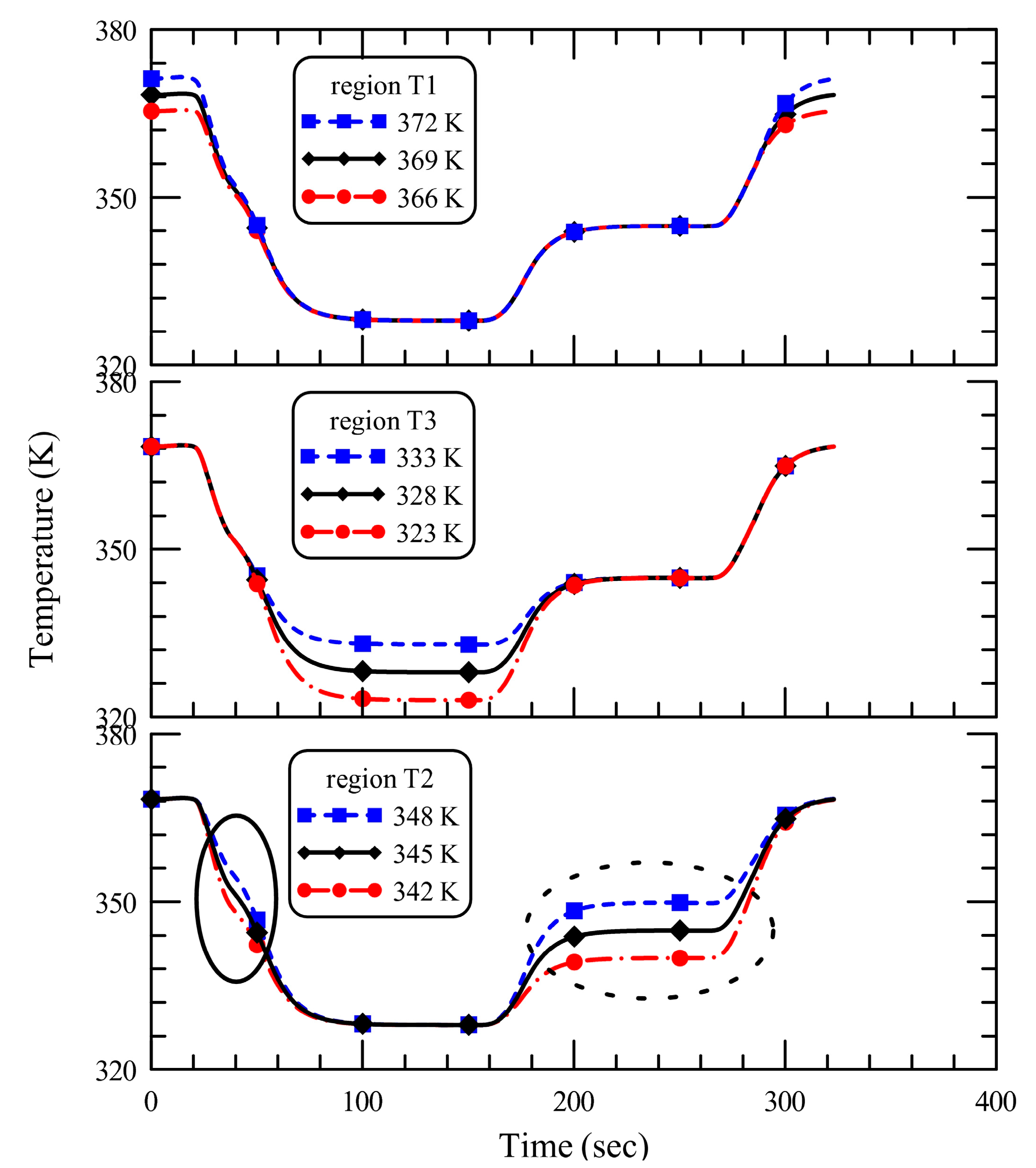 In our simulation, the region T1 is heated to 368 K, the region T2 is maintained at 328 K, and the region T3 is set at 345 K. It is not reasonable to assume that the ambient temperature is equal to 300 K (i.e., the ambient temperature) in the 12 mm gap which is sandwiched between two high temperature regions. The temperatures between two temperature regions at three points are measured. One of them is located at the central location of the cooling region. The distance between two neighboring measured points is 3 mm. Then the gaps between the heating blocks are exposed to the temperatures of 350 K and 335 K which are the average temperatures measured in the air gaps between region T1/region T2 and region T2/region T3, respectively. The temperature between the working regions is affected by the temperatures of the working regions, and the convection effect at the boundary surfaces is dominated by the temperature difference between the chamber temperature and the ambient temperature. To understand the natural convection on the chamber temperature, the effect of various ambient temperatures on the temperature in the reaction chamber is also investigated, but not shown. The ambient temperature can be changed from 300 to 350 K. In the cooling region, the sample temperature dips below the temperature of the working region. Then the temperature starts to rise as the chamber enters another working region. The sample temperature can achieve the reaction temperature during the reaction time for different ambient temperatures. However, the influence of various cooling temperatures on the sample temperature is negligible.