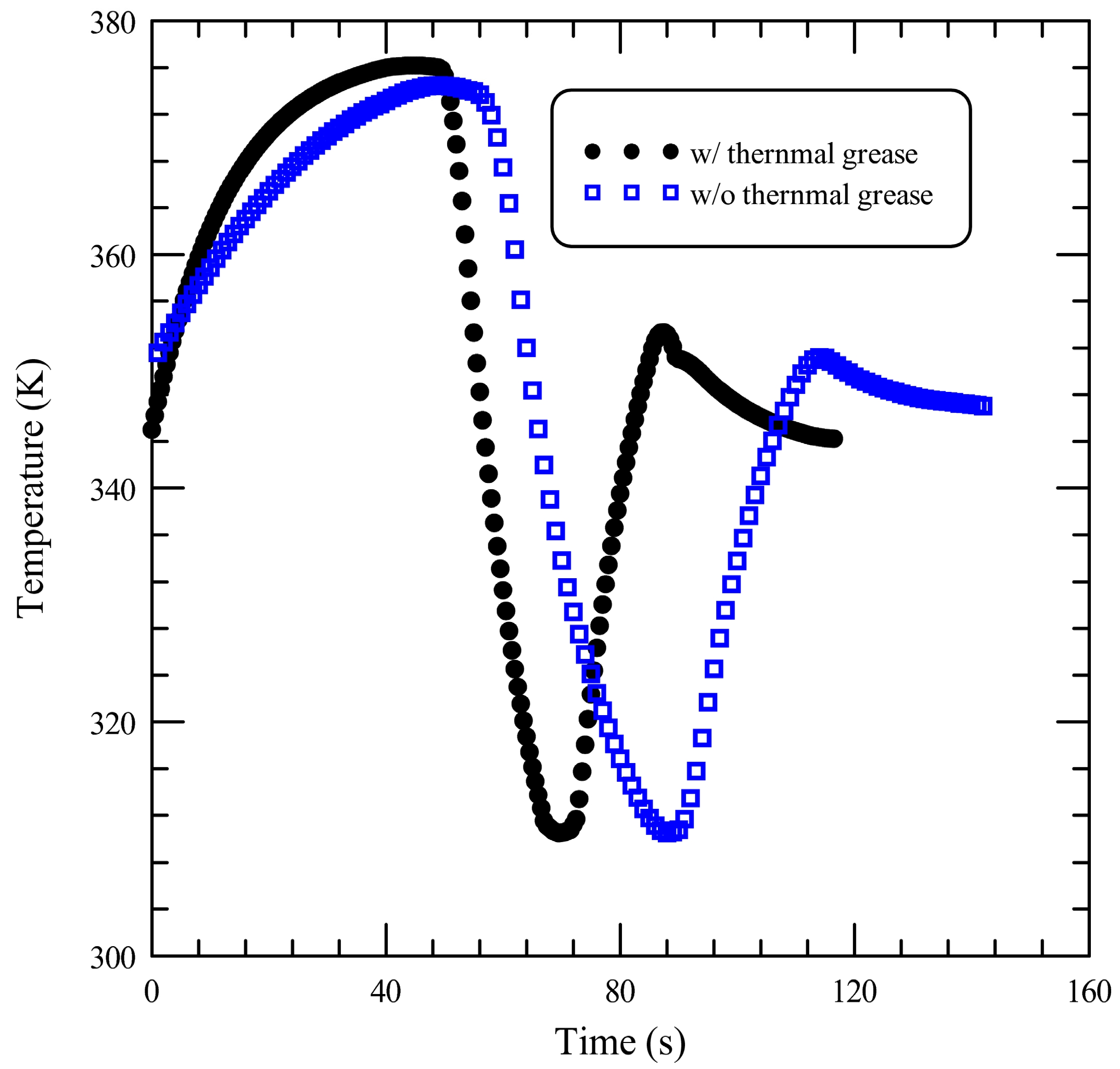 Due to the imperfectly flat surfaces of the chamber and the heater block, some thermal grease is applied between these contacting components to increases heat conduction. The comparison between the central temperatures of the solution with and without thermal grease on the contacting surfaces is depicted in Figure 11. By applying the thermal grease between the contact surfaces, the thermal resistance effect will be reduced. It can be seen that the ramping rate (the slope of the temperature profiles) is larger for the case with thermal grease than that without thermal grease. By keeping the chamber temperature deviated with a variation of less than 2 K and the duration time at each step more than 10 s, the chamber moves along the path at a forward speed equal to 3.3 or 2.8 mm/s from the beginning of the first heating region, then changed to 1.1 or 0.9 mm/s at the beginning of the second cooling region, and finally a backward speed equal to 1.1 or 0.9 mm/s with or without thermal grease on the contacting surfaces, respectively. It is found that the thermal contact effect between the chamber surface and the heater surface is improved, and the required reaction time is dramatically reduced by 20%.