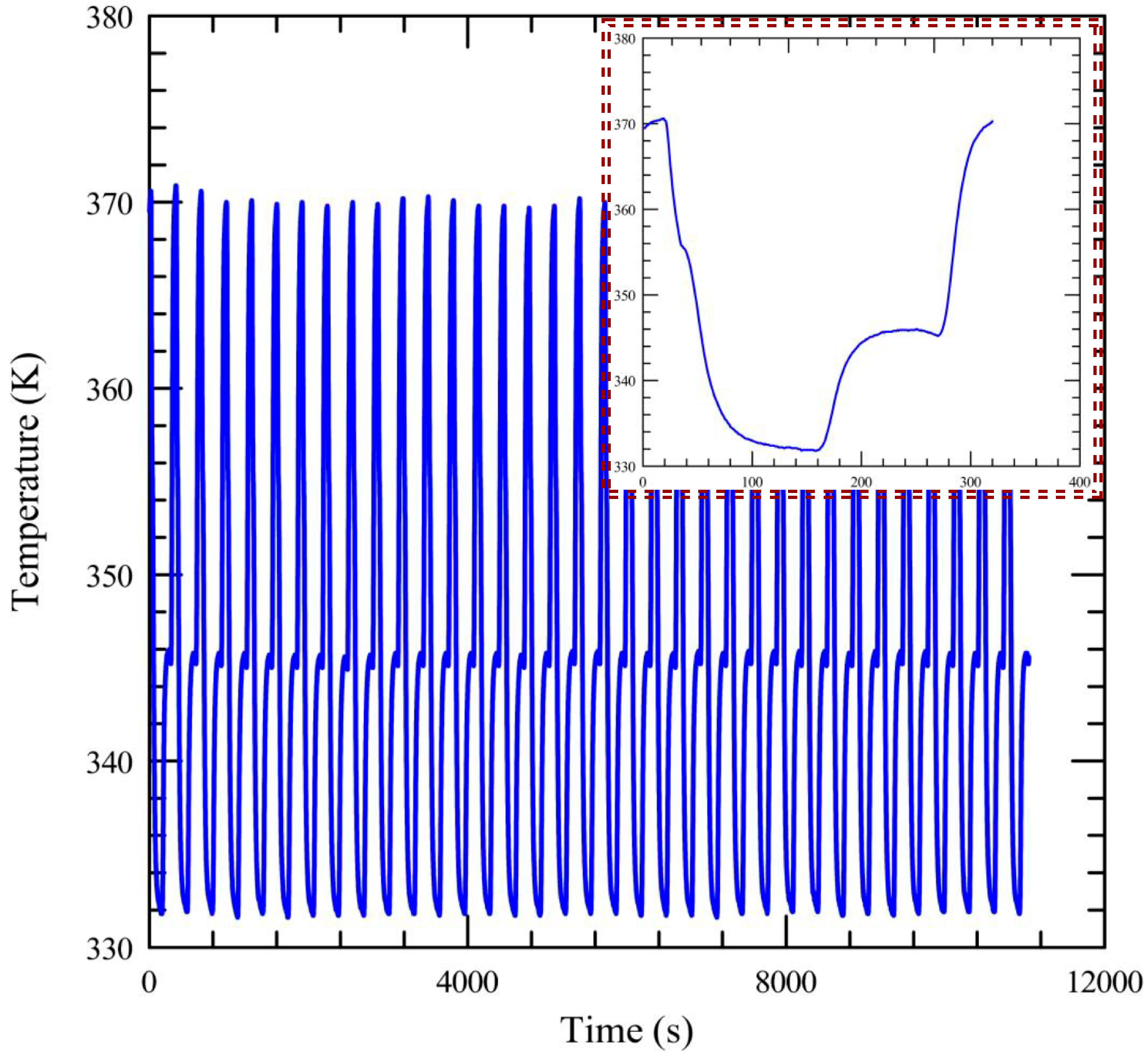 The stability of the bidirectional thermocycler is examined and demonstrated in Figure 12. The small picture illustrated at the top right side of Figure 12 is the temperature profile of the fifth cycle at the center of the sample during the whole thermal cycling process. The chamber moves through three sequential isothermal (371, 351 and 326 K) zones. The chamber is loaded with water covered by some mineral oil. The thermal cycling profile of the central location of the sample is monitored by the thermocouple inserted into the chamber near the center of the sample. The maximum heating and cooling rates during this thermal cycle are 0.878 and 1.037 K/s, respectively. The standard deviations of the temperatures at 34 cycles of measurements are within 0.4 K, and the temperature deviation in the sample during the three working regions is measured to be less than 2 K. It demonstrates that the temperature curve of the sample at the first cycle is similar to that at the last cycle, and the stability of this bidirectional thermal cycler chamber is then confirmed. The surface temperature of the chamber is also measured on the surface of the chamber in the z-direction, and compared with the center temperature of the chamber. When the PCR is proceeding, it is not recommended to insert the thermocouple into the chamber and thus the measurement of the surface temperature can be used to be the reference information.