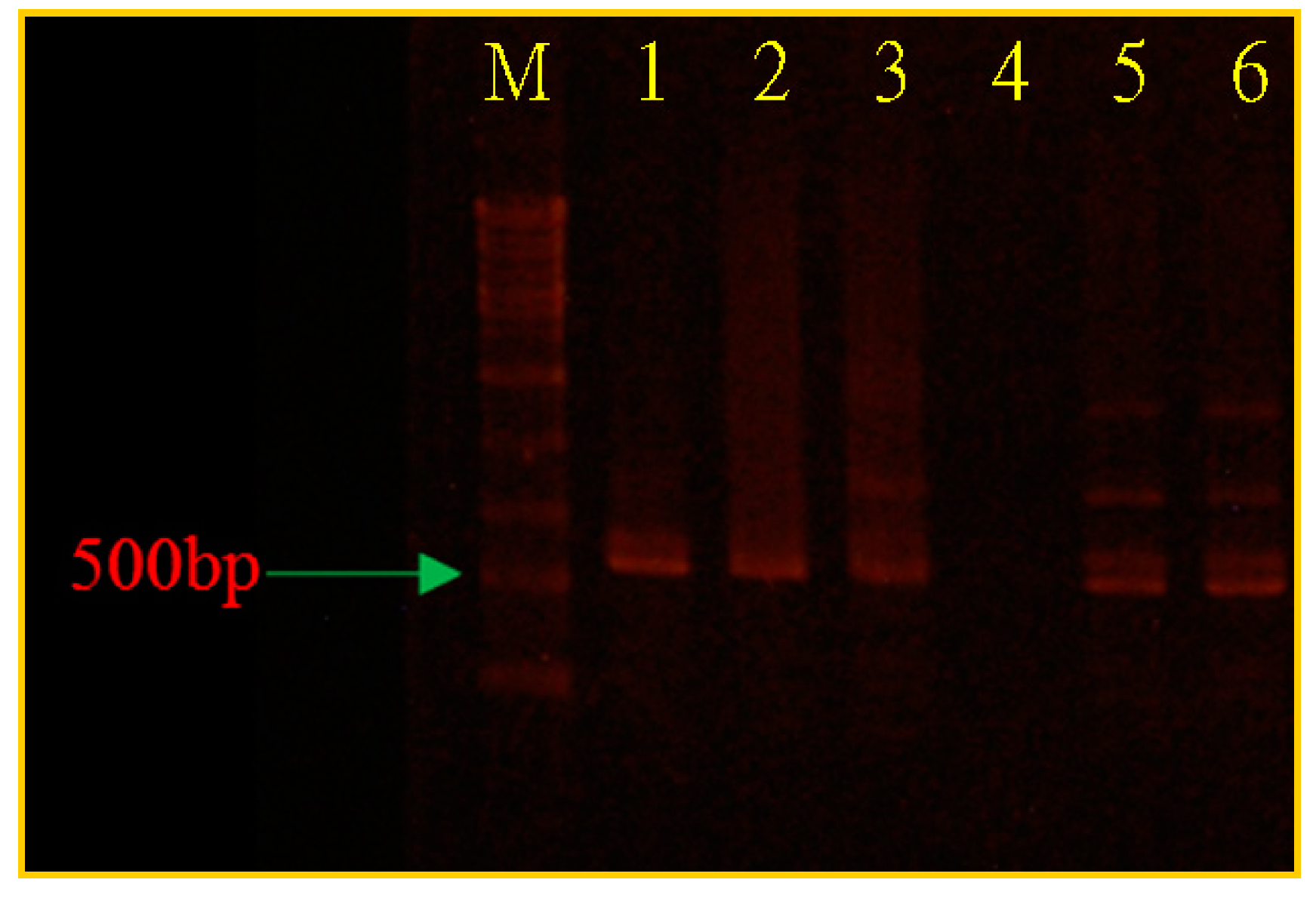 Agarose gel electrophoresis of the polymerase chain reaction (PCR) yield. Lane M: size marker; lane 1: positive control; lane 2: 0.1 μL of input Taq polymerase, 0.6 mm/s of moving speed; lane 3: 0.5 μL of input Taq polymerase, 0.6 mm/s of moving speed; lane 4: negative control; lane 5: 2.5 μL of input Taq polymerase, 0.6 mm/s of moving speed; lane 6: 2.5 μL of input Taq polymerase, 0.72 mm/s of moving speed.